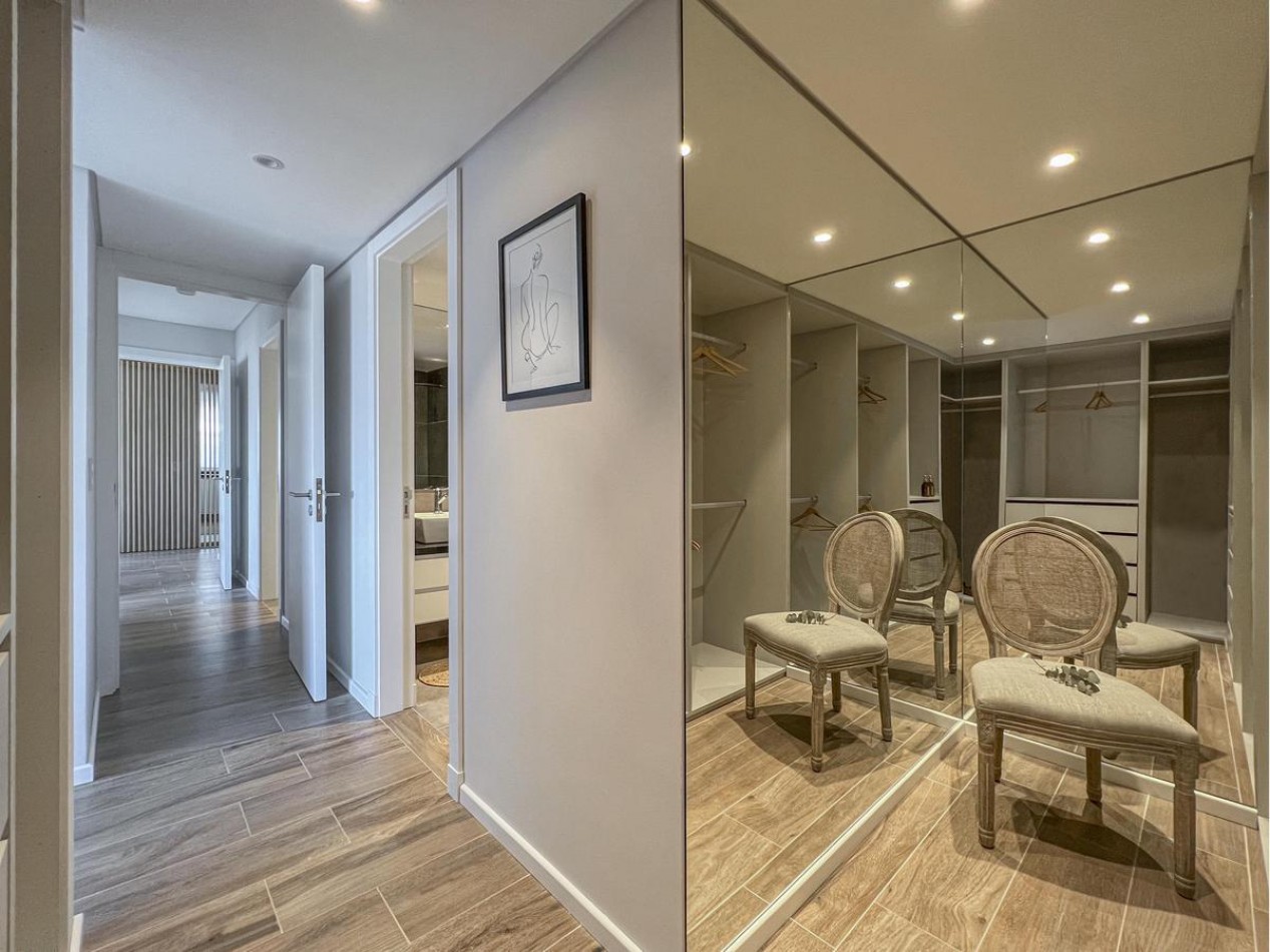Dos/tres dormitorios, el principal con vestidor y baño en suite, y el/los secundario/s con placard. Todos los placares cuentan con puertas corredizas con espejo. Baños completos, con loza sanitaria de marca ferrum y botón de descarga directa en inodoros, la grifería FV línea Libby y bacha, con mesada de mármol sintético blanco. Pisos de PVC de primera calidad y acabado Roble claro.